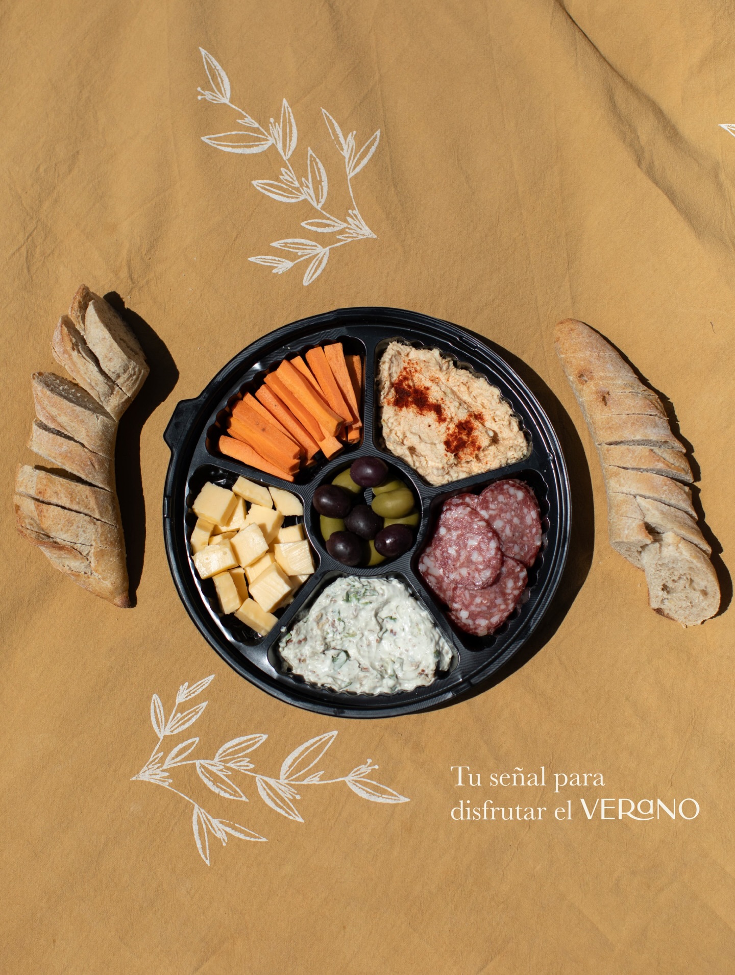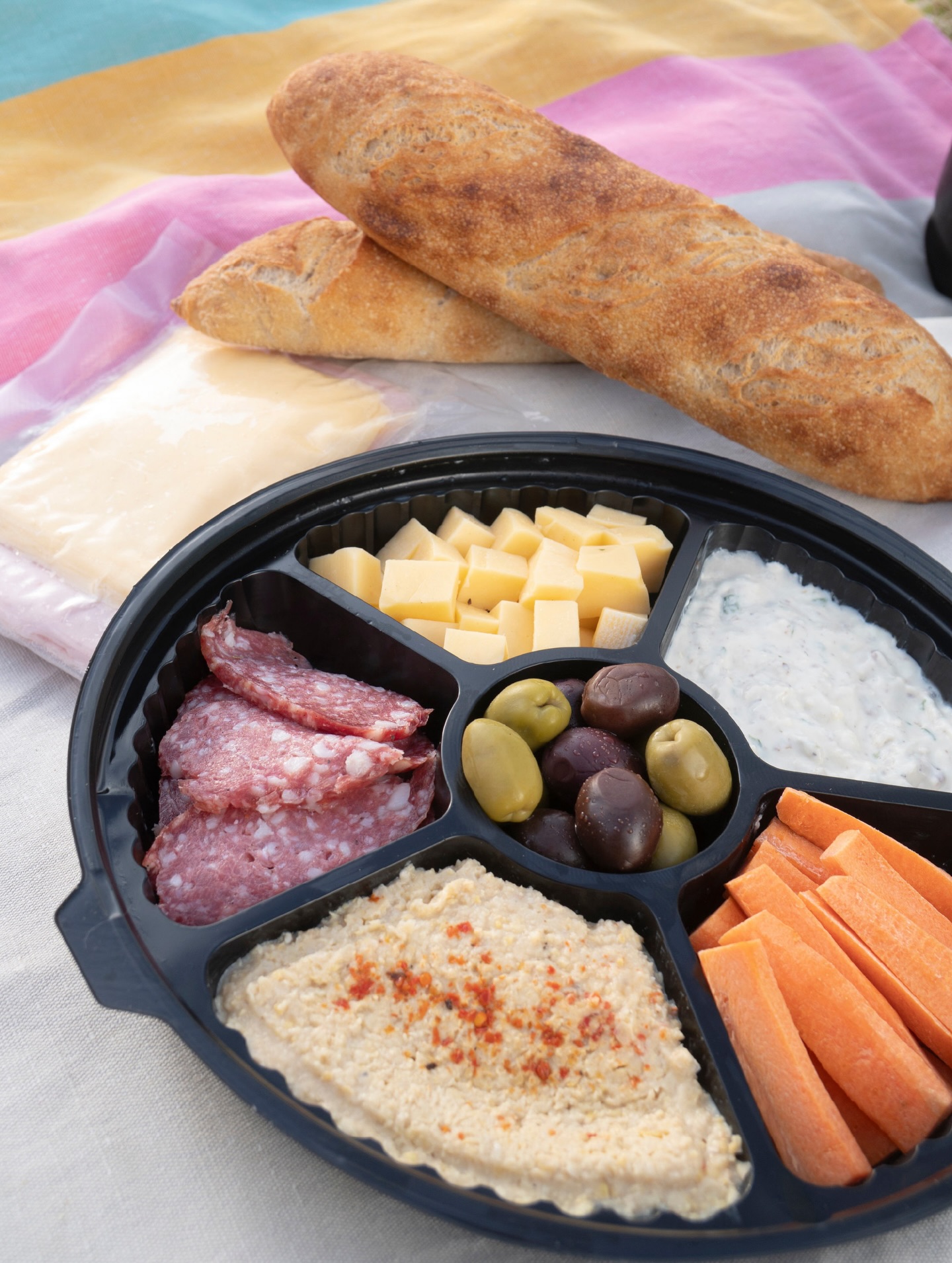 – salame, queso, hummus, queso crema, queso azul, aceitunas, bastones de zanahoria, jamón cocido y queso en fetas